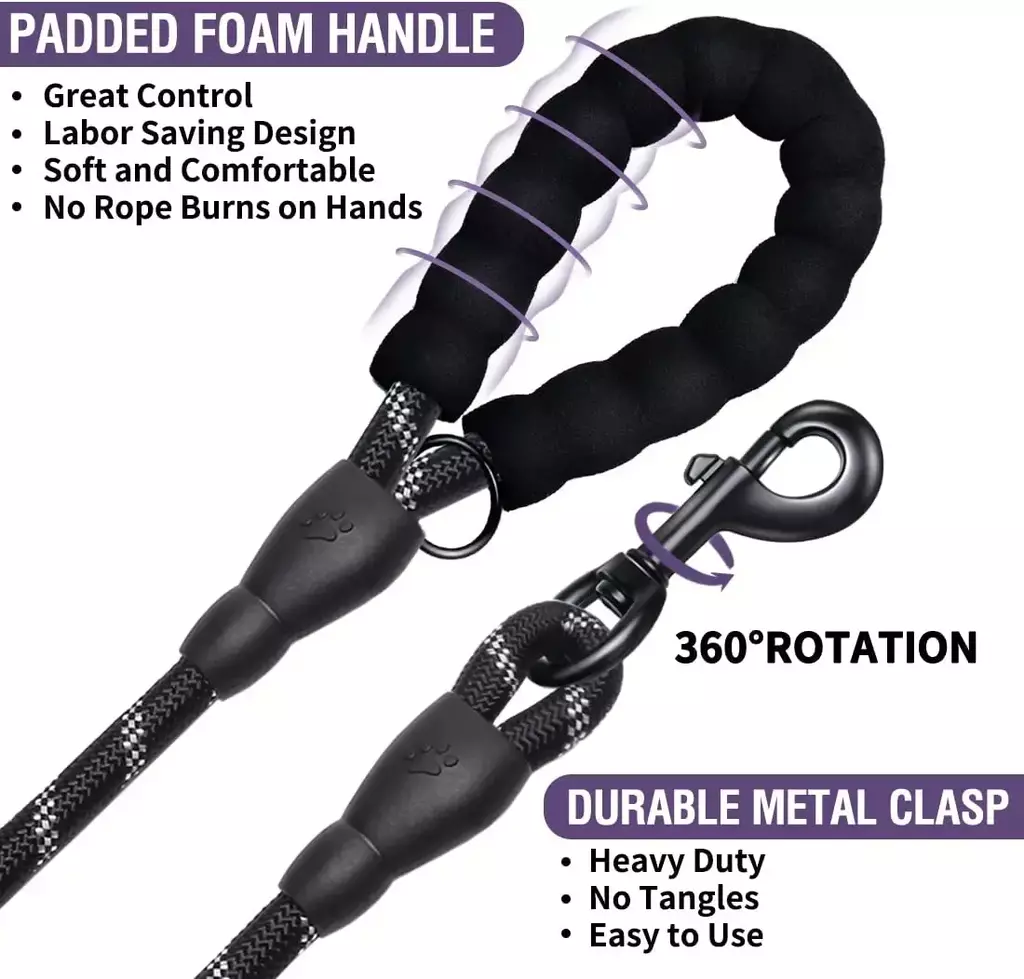 ✨ Segurança Noturna: O design inteligente inclui fios reflexivos entrelaçados em toda a extensão da corda. Ao ser iluminada por faróis de carros à noite, a coleira brilha, garantindo visibilidade e proteção extra para você e seu pet.